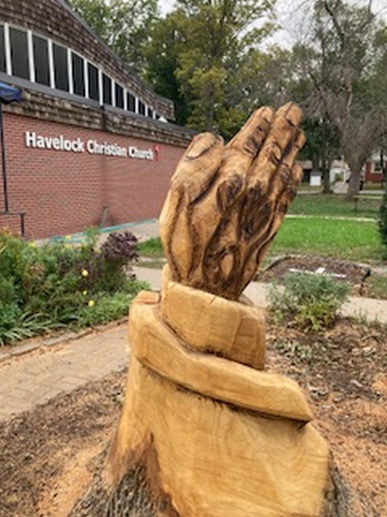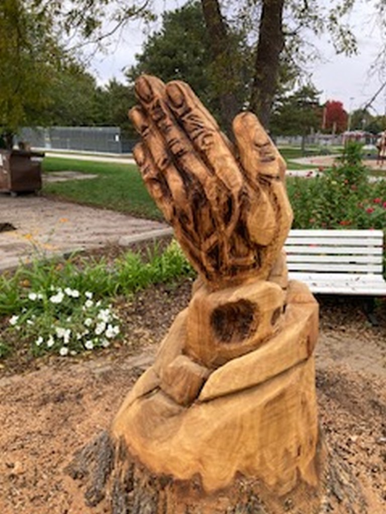 Artist Nate Hall of 3-Timber Studio is the sculptor of the praying hands.